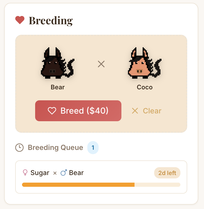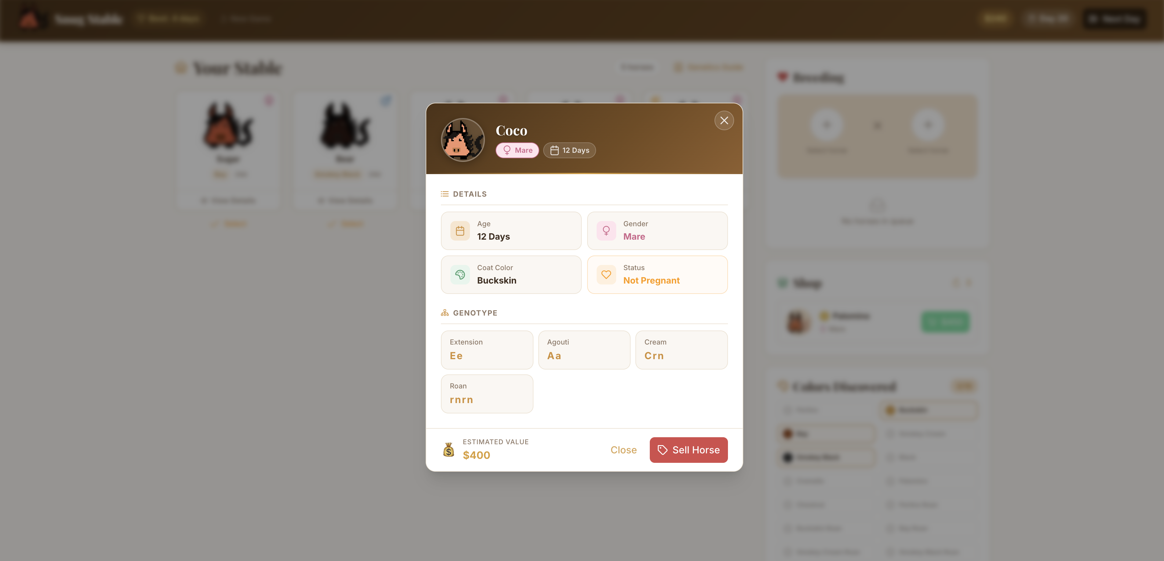 Buy mares and stallions from the shop, pair them up, and wait for foals to be born. Each horse carries a unique genotype — Extension, Agouti, Cream, and Roan alleles — that determines their coat color. Plan your breeding strategy to unlock all 18 coat colors, from common bays and chestnuts to rare palominos, cremellos, and roan variants.