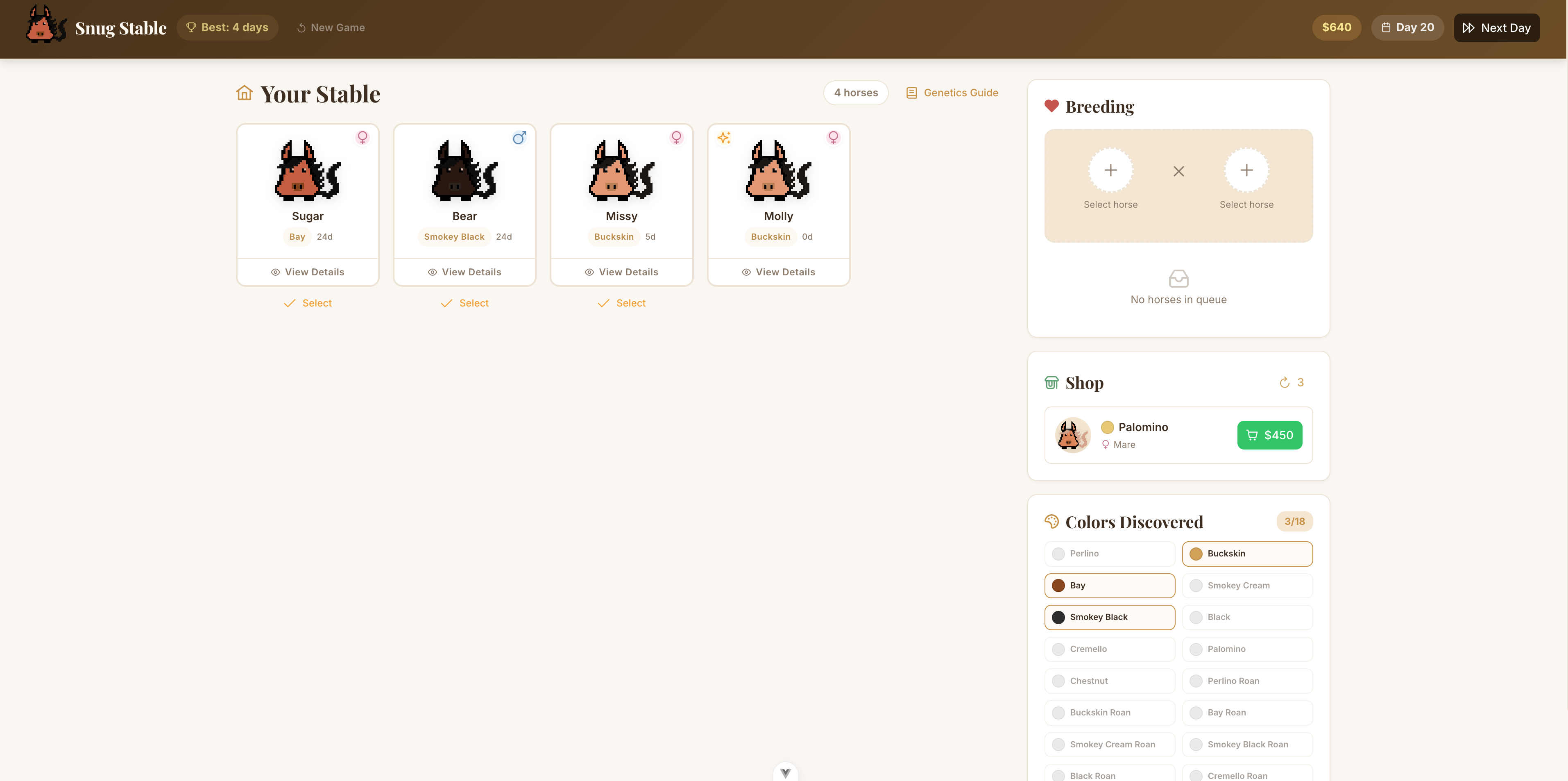 Snug Stable is a cozy horse breeding strategy game rooted in real equine genetics.
